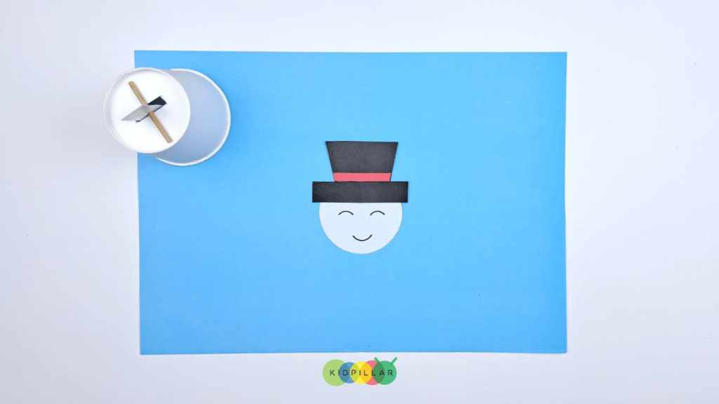 Step 5: Glue the red strip on the black hat and paste the completed hat on the white circle to complete the face of the snowman craft.