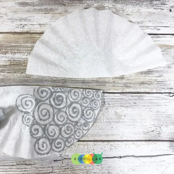 1. Fold the coffee filter in half and using silver glitter glue, make a swirl pattern on the folded coffee filter. Let it dry.