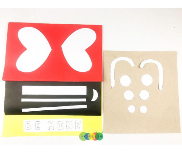 Step 2. Paste the heart on the red construction paper; rectangular strips, triangle and crescent shape on black construction paper and ‘Bee Mine’ on yellow paper. Cut out all the pieces using scissors.