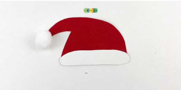 3. To make Santa’s cap, paste the white band on the cap and white cotton ball/ pom-pom on the end.