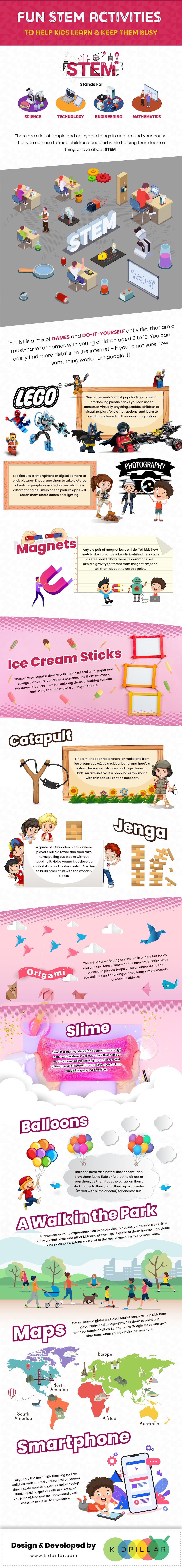 Dealing with bored or uninterested kids shouldn’t be a concern anymore. Kidpillar wants to bring STEM learning to every home and classroom, and we endeavor to keep kids thinking, doing and learning with every single activity that they undertake. So, we’ve put together this fun infographic that list out some simple ways in which you can keep kids occupied for hours (and in some cases, days) while they develop essential life skills and gain fundamental bits of scientific knowledge that will stay with them for the rest of their lives!