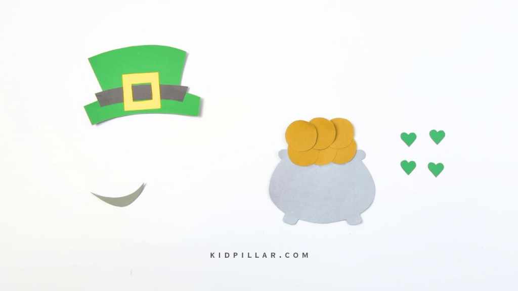 We used silver paper for the pot, green craft paper for hat & hearts, yellow for the buckle, black for the band and gold for the coins.